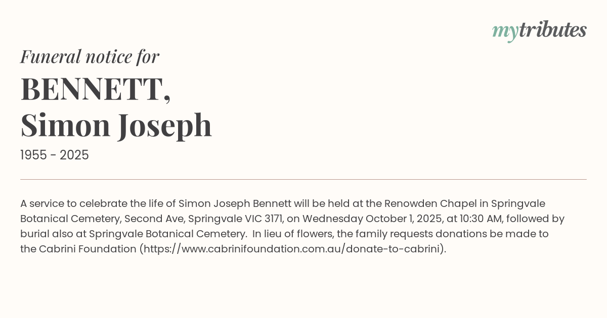 A service to celebrate the life of Simon Joseph Bennett will be held at the Renowden Chapel in Springvale Botanical Cemetery, Second Ave, Springvale VIC 3171, on Wednesday October 1, 2025, at 10:30 AM, followed by burial also at Springvale Botanical Cemetery. In lieu of flowers, the family requests donations be made to the Cabrini Foundation (https://www.cabrinifoundation.com.au/donate-to-cabrini).