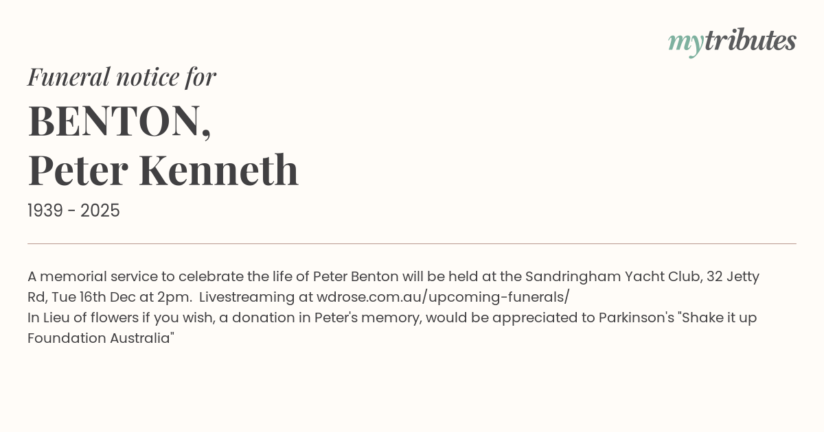 A memorial service to celebrate the life of Peter Benton will be held at the Sandringham Yacht Club, 32 Jetty Rd, Tue 16th Dec at 2pm. Livestreaming at wdrose.com.au/upcoming-funerals/
