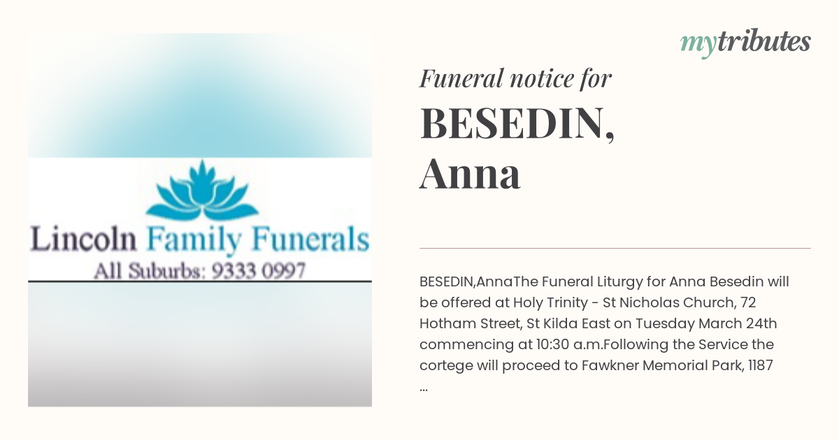 The Funeral Liturgy for Anna Besedin will be offered at Holy Trinity - St Nicholas Church, 72 Hotham Street, St Kilda East on Tuesday March 24th commencing at 10:30 a.m.