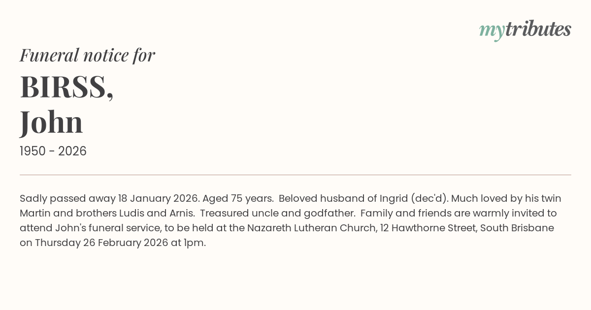 Sadly passed away 18 January 2026. Aged 75 years. Beloved husband of Ingrid (dec'd). Much loved by his twin Martin and brothers Ludis and Arnis. Treasured uncle and godfather. Family and friends are warmly invited to attend John's funeral service, to be held at the Nazareth Lutheran Church, 12 Hawthorne Street, South Brisbane on Thursday 26 February 2026 at 1pm.