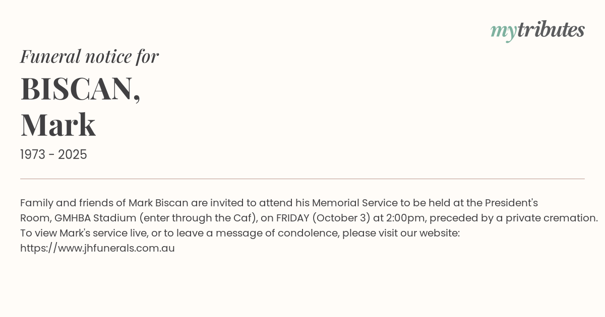 Family and friends of Mark Biscan are invited to attend his Memorial Service to be held at the President's Room, GMHBA Stadium (enter through the Café), on FRIDAY (October 3) at 2:00pm, preceded by a private cremation. To view Mark's service live, or to leave a message of condolence, please visit our website: https://www.jhfunerals.com.au