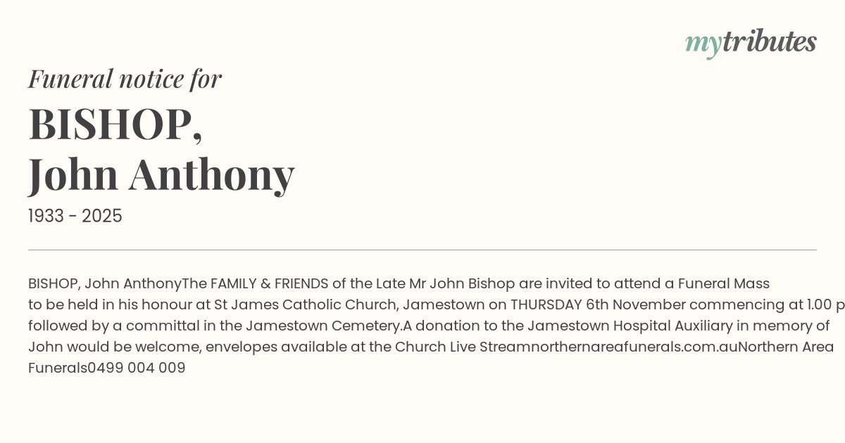 The FAMILY & FRIENDS of the Late Mr John Bishop are invited to attend a Funeral Mass to be held in his