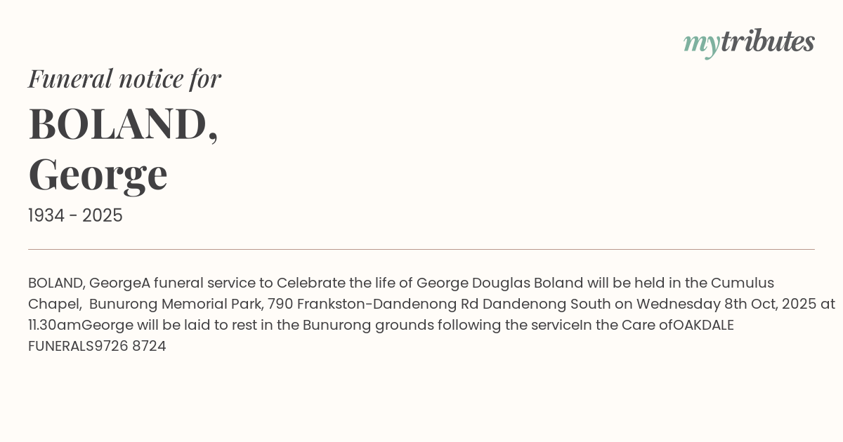 A funeral service to Celebrate the life of George Douglas Boland will be held in the Cumulus Chapel, Bunurong Memorial Park, 790 Frankston-Dandenong Rd Dandenong South on Wednesday 8th Oct, 2025 at 11.30am