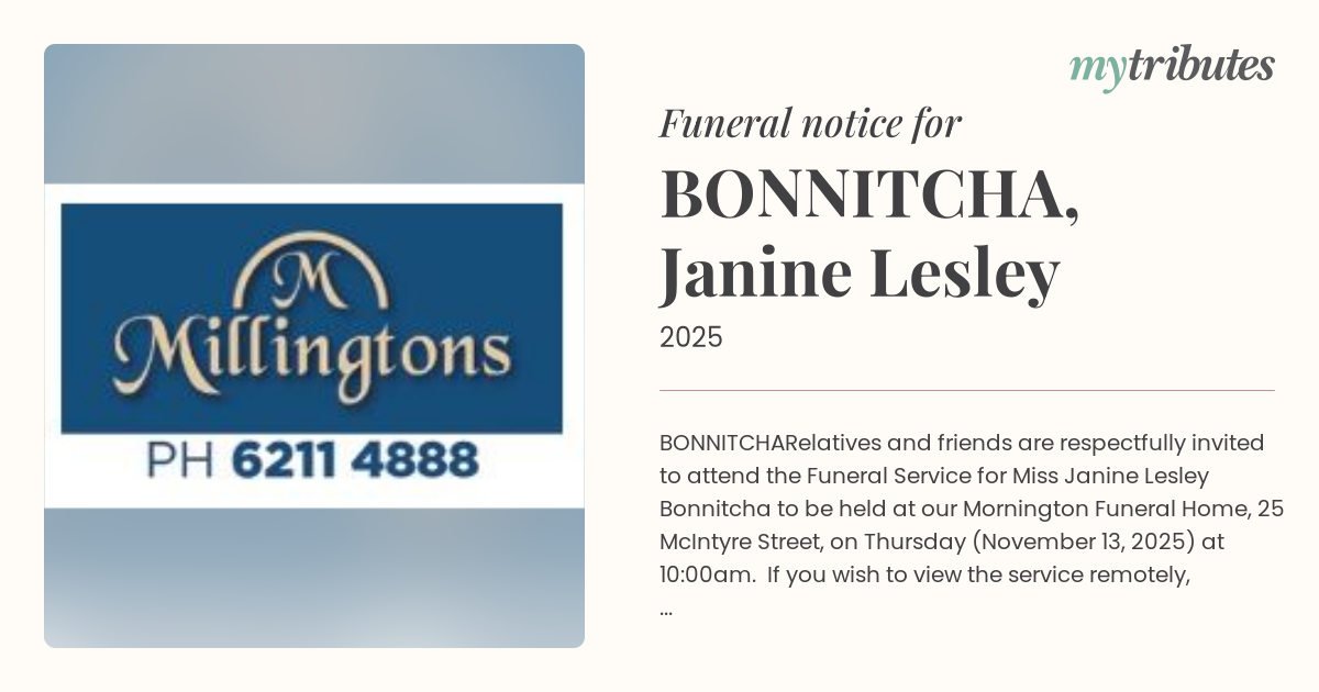 Relatives and friends are respectfully invited to attend the Funeral Service for Miss Janine Lesley Bonnitcha to be held at our Mornington Funeral Home, 25 McIntyre Street, on Thursday (November 13, 2025) at 10:00am. If you wish to view the service remotely, please go to millingtons.com.au/