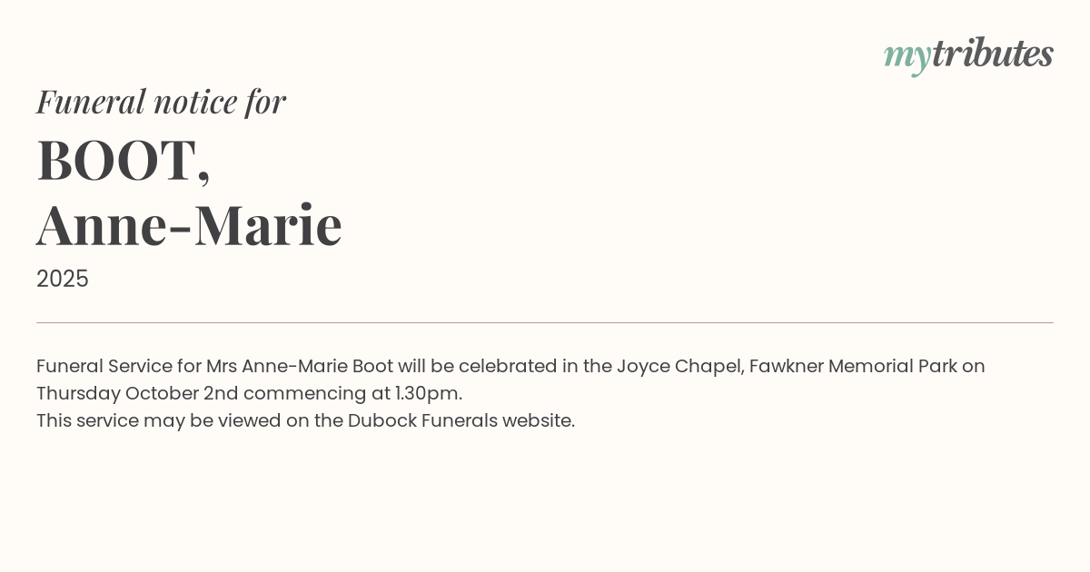 Funeral Service for Mrs Anne-Marie Boot will be celebrated in the Joyce Chapel, Fawkner Memorial Park on Thursday October 2nd commencing at 1.30pm.
