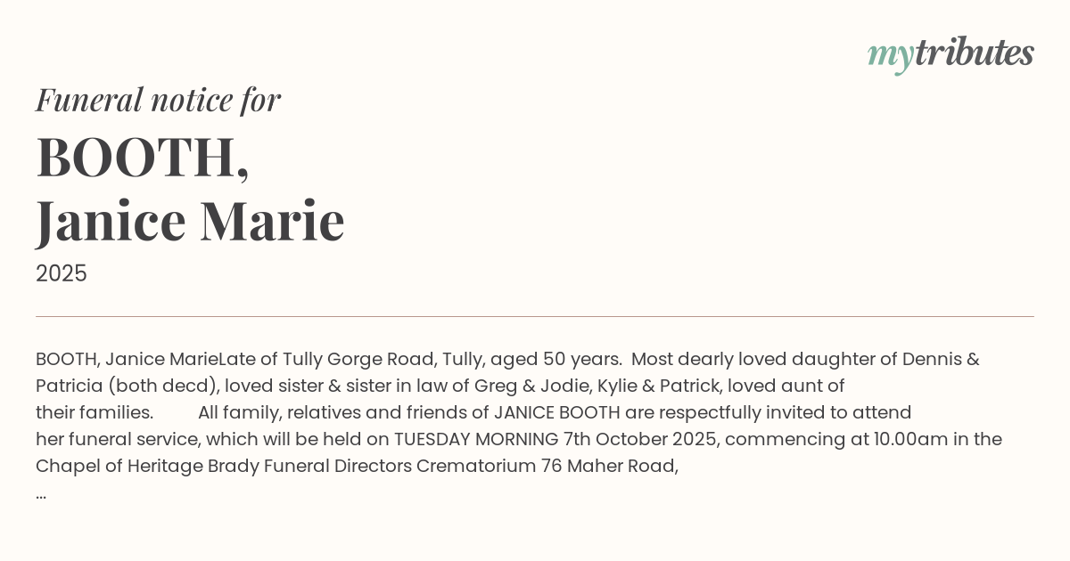 All family, relatives and friends of JANICE BOOTH are respectfully invited to attend her funeral service, which will be held on TUESDAY MORNING 7th October 2025, commencing at 10.00am in the Chapel of Heritage Brady Funeral Directors Crematorium