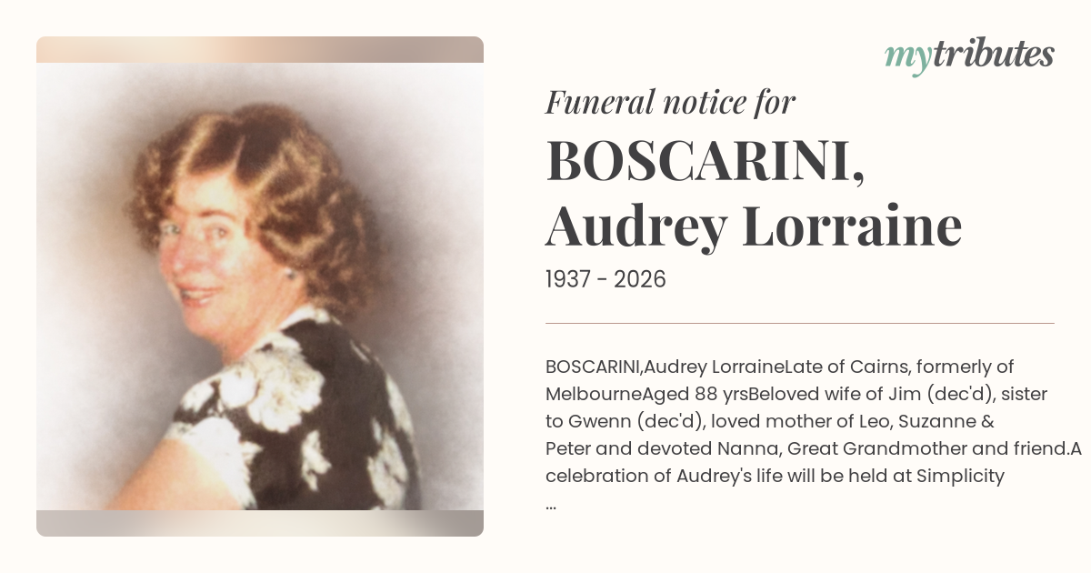 A celebration of Audrey's life will be held at Simplicity Chapel,411 Mulgrave Rd, Westcourt, Queensland 10am, 25th March 2026