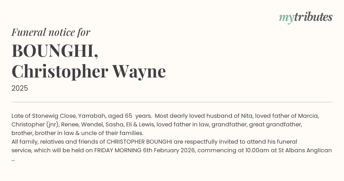 All family, relatives and friends of CHRISTOPHER BOUNGHI are respectfully invited to attend his funeral service, which will be held on FRIDAY MORNING 6th February 2026, commencing at 10.00am at St Alban’s Anglican Church, Yarrabah, followed by interment at the Yarrabah Monumental Cemetery.