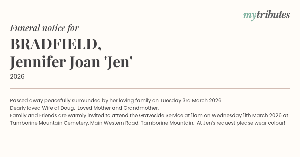 Passed away peacefully surrounded by her loving family on Tuesday 3rd March 2026. Dearly loved Wife of Doug. Loved Mother and Grandmother. Family and Friends are warmly invited to attend the Graveside Service at 11am on Wednesday 11th March 2026 at Tamborine Mountain Cemetery, Main Western Road, Tamborine Mountain. At Jen's request please wear colour!