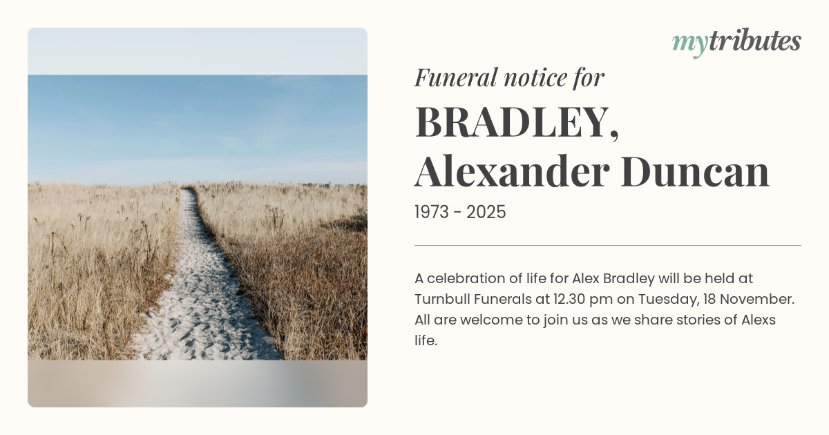 A celebration of life for Alex Bradley will be held at Turnbull Funerals at 12.30 pm on Tuesday, 18 November. All are welcome to join us as we share stories of Alex’s life.
