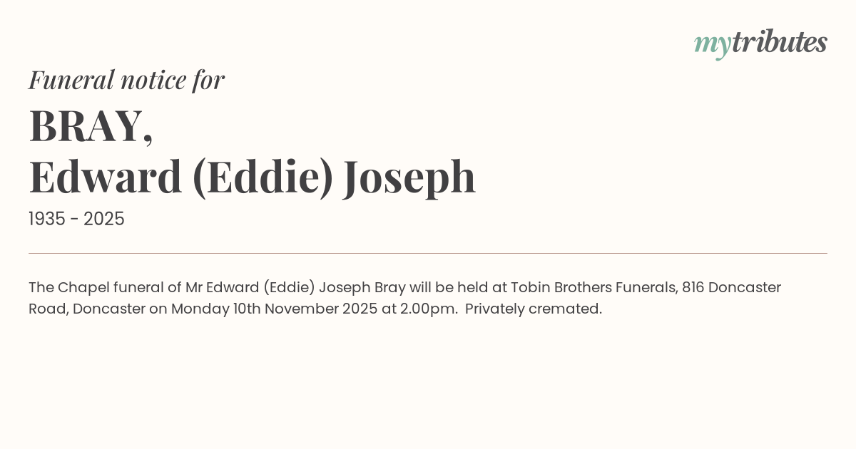 The Chapel funeral of Mr Edward (Eddie) Joseph Bray will be held at Tobin Brothers Funerals, 816 Doncaster Road, Doncaster on Monday 10th November 2025 at 2.00pm. Privately cremated.