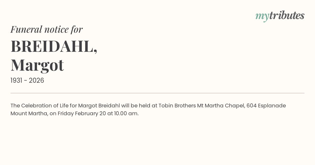 The Celebration of Life for Margot Breidahl will be held at Tobin Brothers Mt Martha Chapel, 604 Esplanade Mount Martha, on Friday February 20 at 10.00 am.