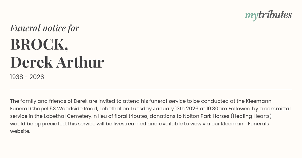 The family and friends of Derek are invited to attend his funeral service to be conducted at the Kleemann Funeral Chapel 53 Woodside Road, Lobethal on Tuesday January 13th 2026 at 10:30am Followed by a committal service in the Lobethal Cemetery.