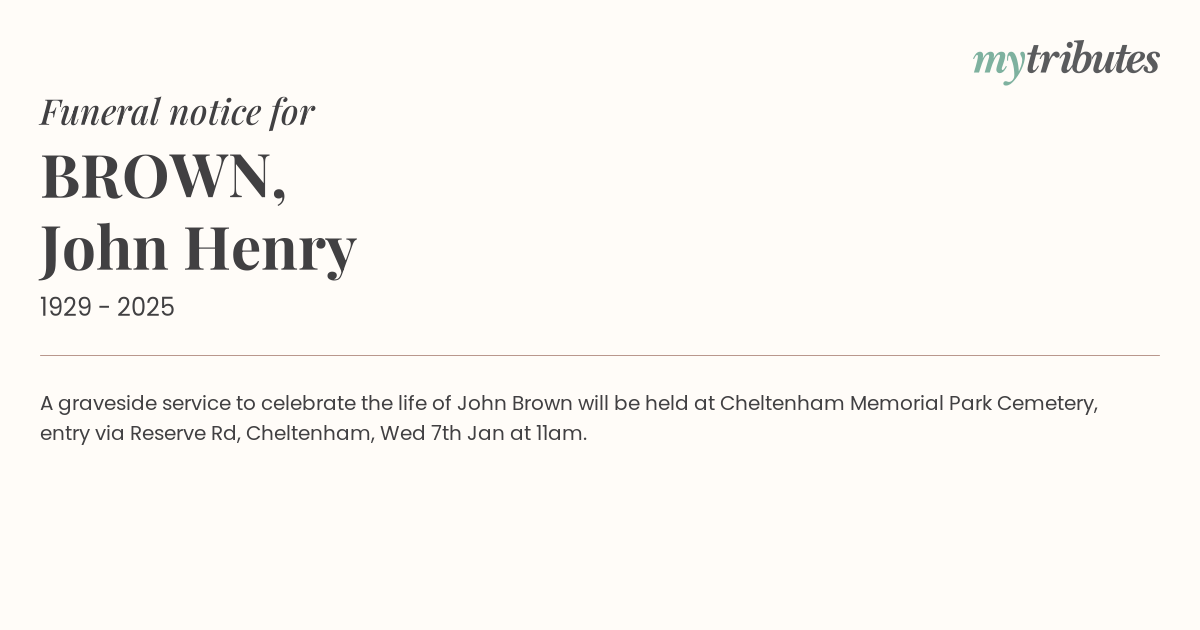 A graveside service to celebrate the life of John Brown will be held at Cheltenham Memorial Park Cemetery, entry via Reserve Rd, Cheltenham, Wed 7th Jan at 11am.