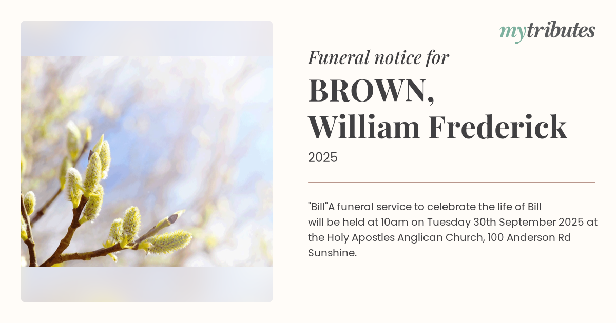 A funeral service to celebrate the life of Bill will be held at 10am on Tuesday 30th September 2025 at the Holy Apostles Anglican Church, 100 Anderson Rd Sunshine.