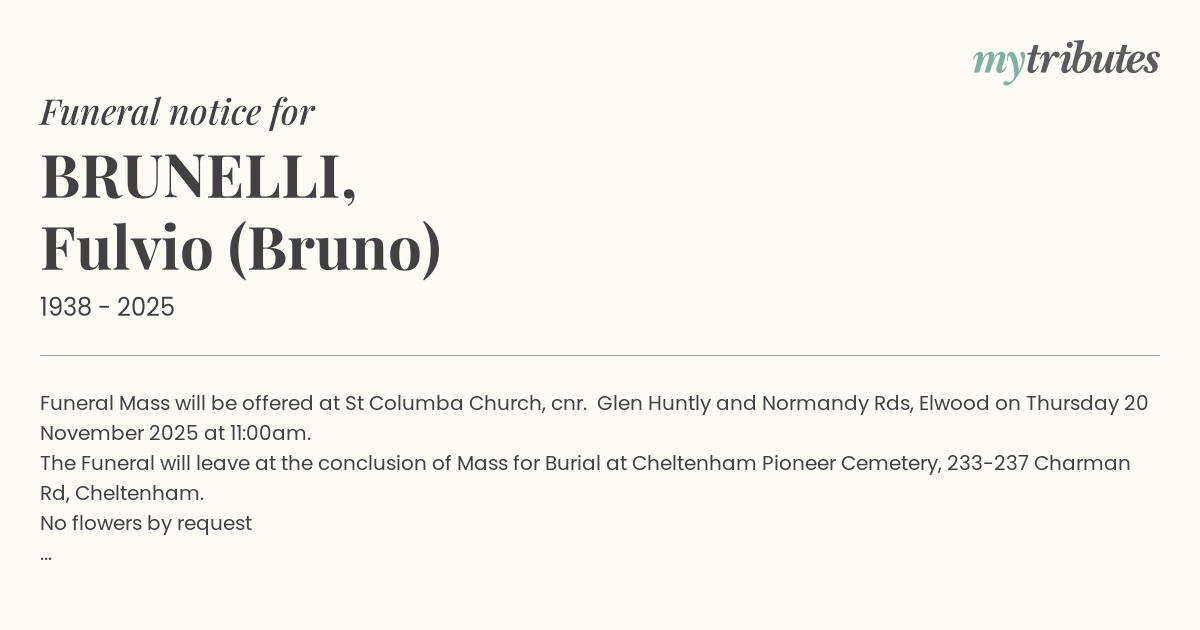 Funeral Mass will be offered at St Columba Church, cnr. Glen Huntly and Normandy Rds, Elwood on Thursday 20 November 2025 at 11:00am.