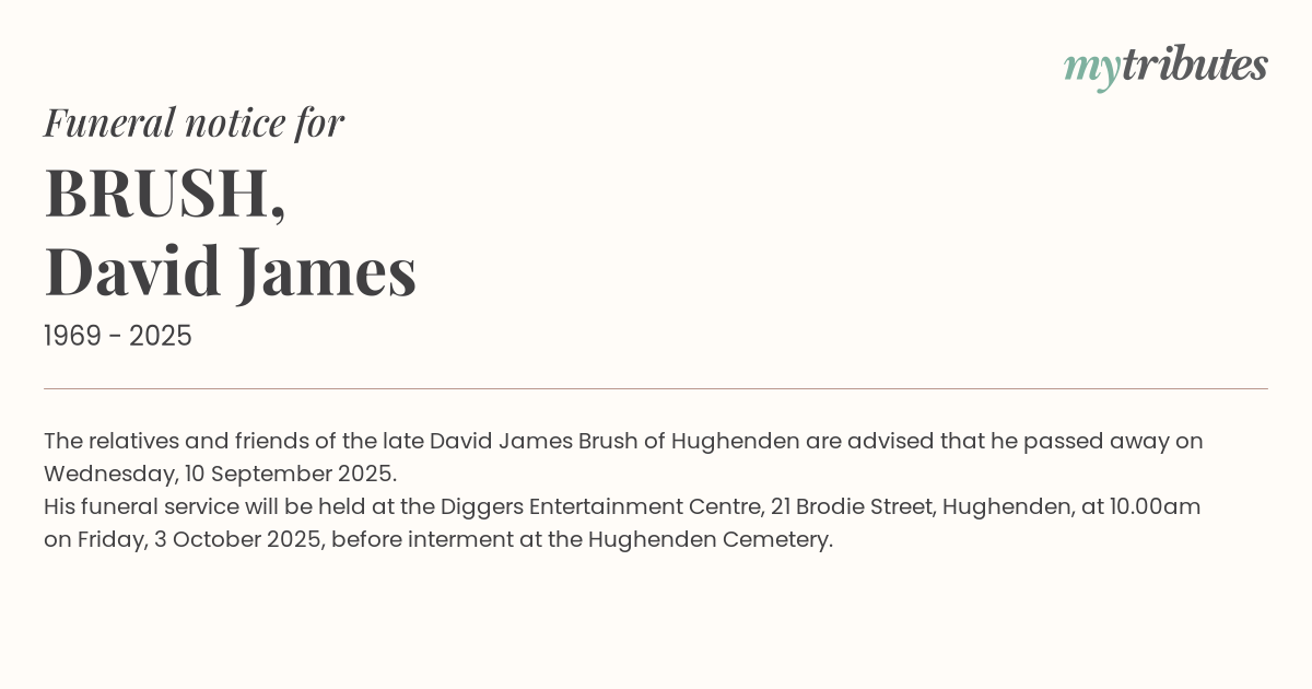 The relatives and friends of the late David James Brush of Hughenden are advised that he passed away on Wednesday, 10 September 2025.