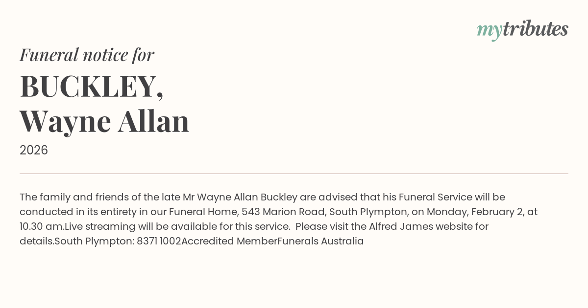 The family and friends of the late Mr Wayne Allan Buckley are advised that his Funeral Service will be conducted in its entirety in our Funeral Home, 543 Marion Road, South Plympton, on Monday, February 2, at 10.30 am.