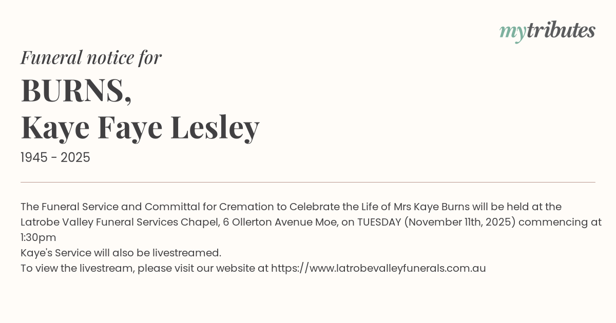 The Funeral Service and Committal for Cremation to Celebrate the Life of Mrs Kaye Burns will be held at the Latrobe Valley Funeral Services Chapel, 6 Ollerton Avenue Moe, on TUESDAY (November 11th, 2025) commencing at 1:30pm