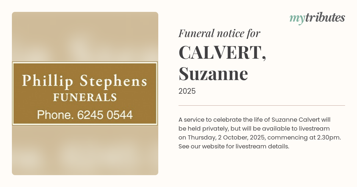 A service to celebrate the life of Suzanne Calvert will be held privately, but will be available to livestream on Thursday, 2 October, 2025, commencing at 2.30pm.