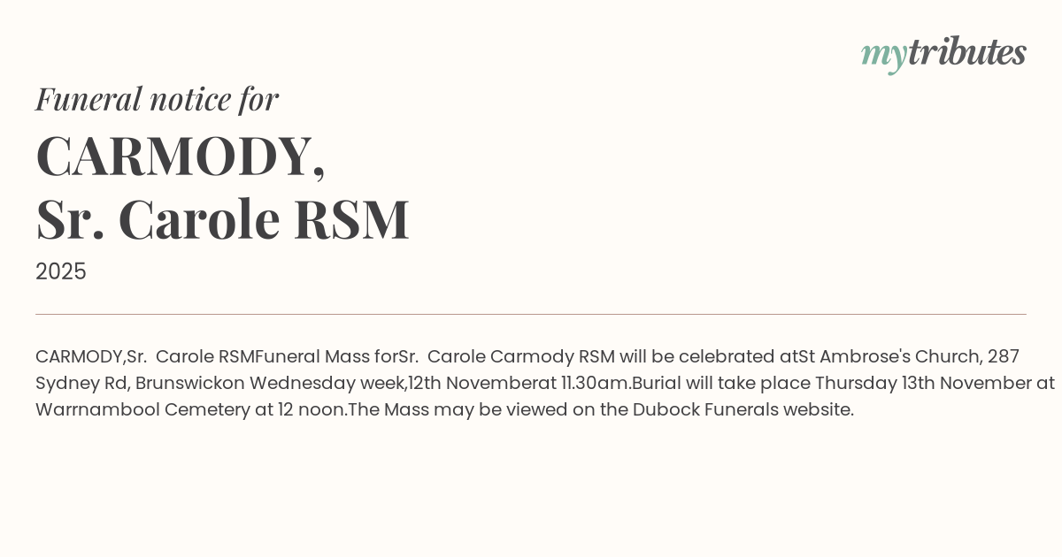 Burial will take place Thursday 13th November at Warrnambool Cemetery at 12 noon.