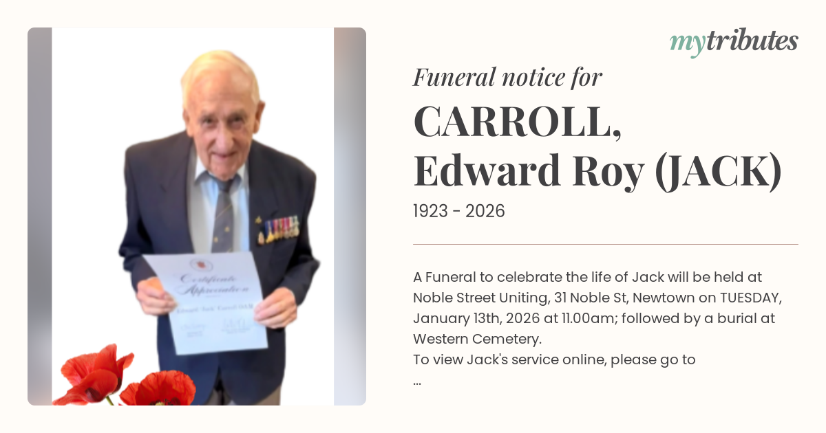 A Funeral to celebrate the life of Jack will be held at Noble Street Uniting, 31 Noble St, Newtown on TUESDAY, January 13th, 2026 at 11.00am; followed by a burial at Western Cemetery.