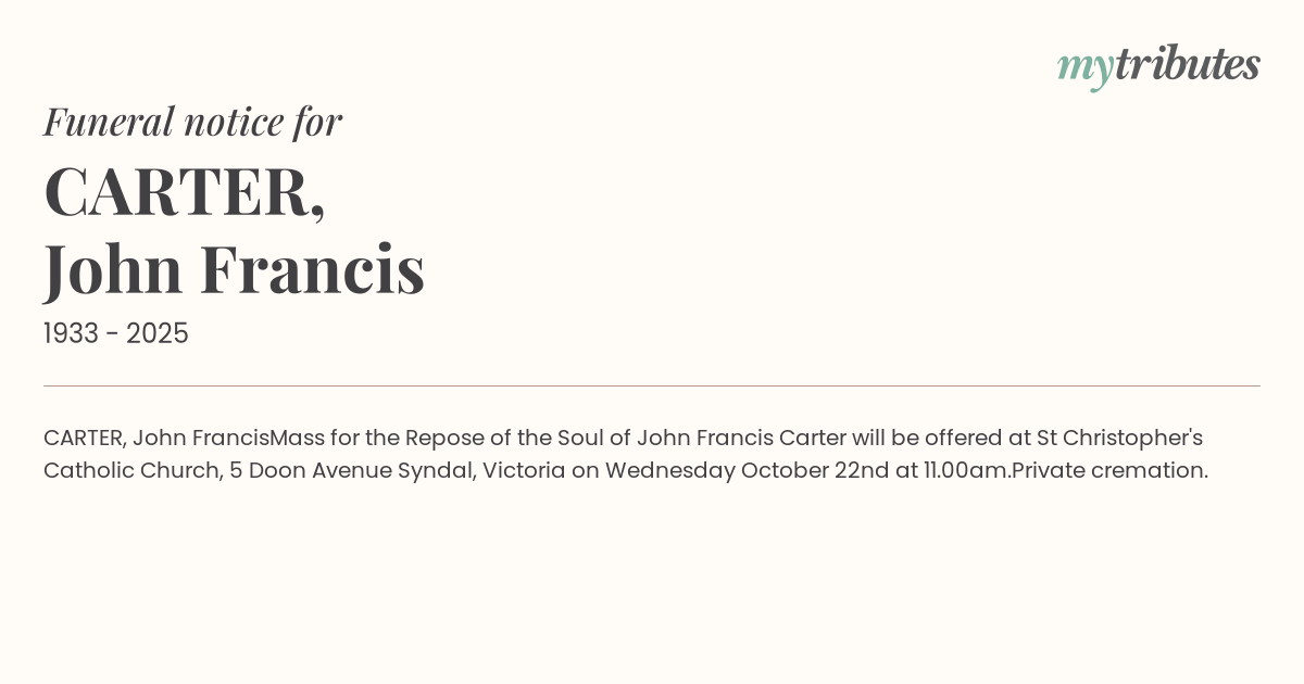 St Christopher's Catholic Church, 5 Doon Avenue Syndal, Victoria on Wednesday October 22nd at 11.00am.