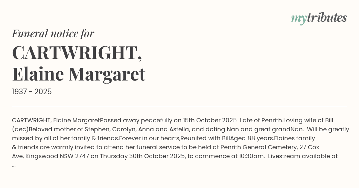 Elaine’s family & friends are warmly invited to attend her funeral service to be held at Penrith General Cemetery, 27 Cox Ave, Kingswood NSW 2747 on Thursday 30th October 2025, to commence at 10:30am. Livestream available at