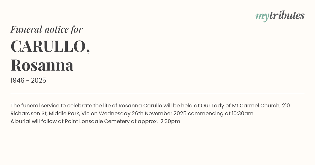 The funeral service to celebrate the life of Rosanna Carullo will be held at Our Lady of Mt Carmel Church, 210 Richardson St, Middle Park, Vic on Wednesday 26th November 2025 commencing at 10:30am
