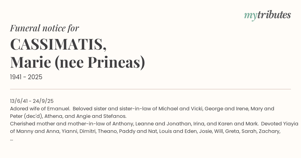 Family and friends are invited to attend Marie's funeral at The Dormition of the Theotokos, 269 Creek Road, Mt.Gravatt on Thursday, 2nd October, 2025 at 1:00pm.