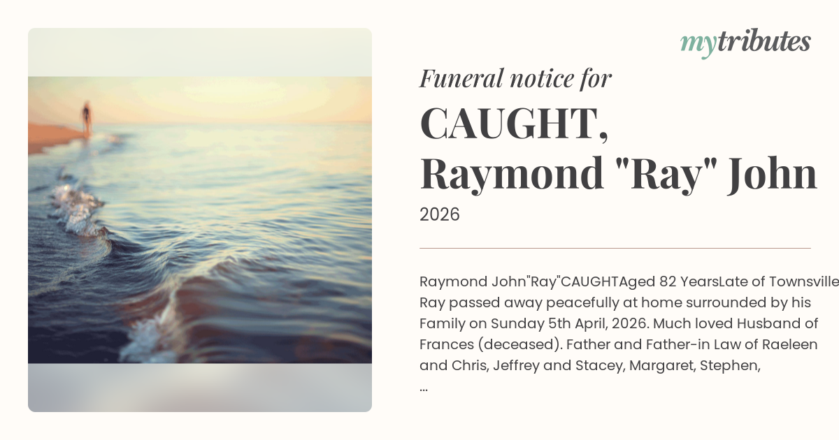 Late of Townsville. Ray passed away peacefully at home surrounded by his Family on Sunday 5th April, 2026. Much loved Husband of Frances (deceased). Father and Father-in Law of Raeleen and Chris, Jeffrey and Stacey, Margaret, Stephen, Narelle and Andrew. Cherished Grandad of Corey, Erica, Stephen, Louise, Cody, Cameron, Imogen, Zoe and Lara.