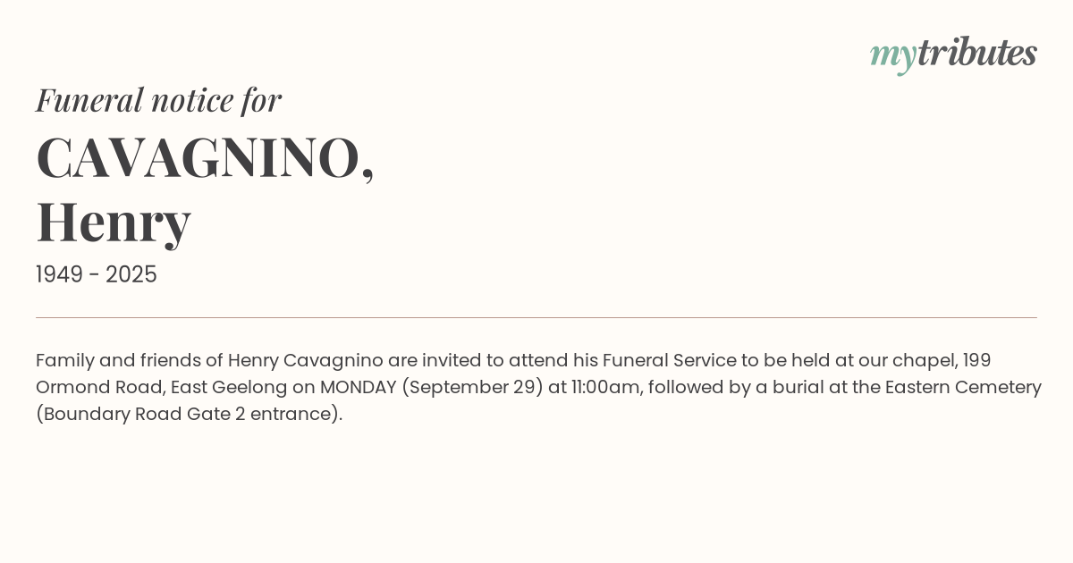 Family and friends of Henry Cavagnino are invited to attend his Funeral Service to be held at our chapel, 199 Ormond Road, East Geelong on MONDAY (September 29) at 11:00am, followed by a burial at the Eastern Cemetery (Boundary Road Gate 2 entrance).