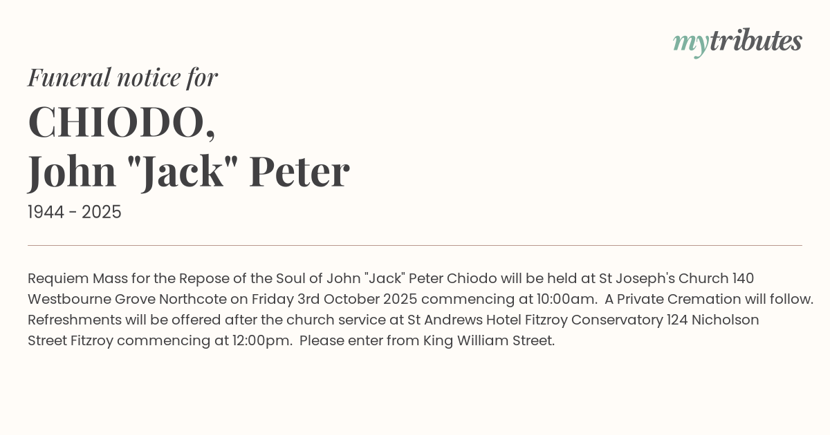 Requiem Mass for the Repose of the Soul of John "Jack" Peter Chiodo will be held at St Joseph's Church 140 Westbourne Grove Northcote on Friday 3rd October 2025 commencing at 10:00am. A Private Cremation will follow. Refreshments will be offered after the church service at St Andrews Hotel Fitzroy Conservatory 124 Nicholson Street Fitzroy commencing at 12:00pm. Please enter from King William Street.