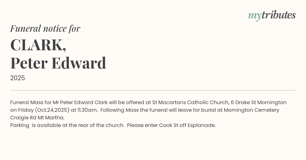 Funeral Mass for Mr Peter Edward Clark will be offered at St Macartans Catholic Church, 6 Drake St Mornington on Friday (Oct.24,2025) at 11.30am. Following Mass the funeral will leave for burial at Mornington Cemetery Craigie Rd Mt Martha.