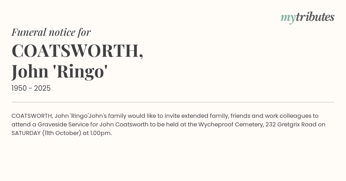 John's family would like to invite extended family, friends and work colleagues to attend a Graveside Service for John Coatsworth to be held at the Wycheproof Cemetery, 232 Gretgrix Road on SATURDAY (11th October) at 1.00pm.