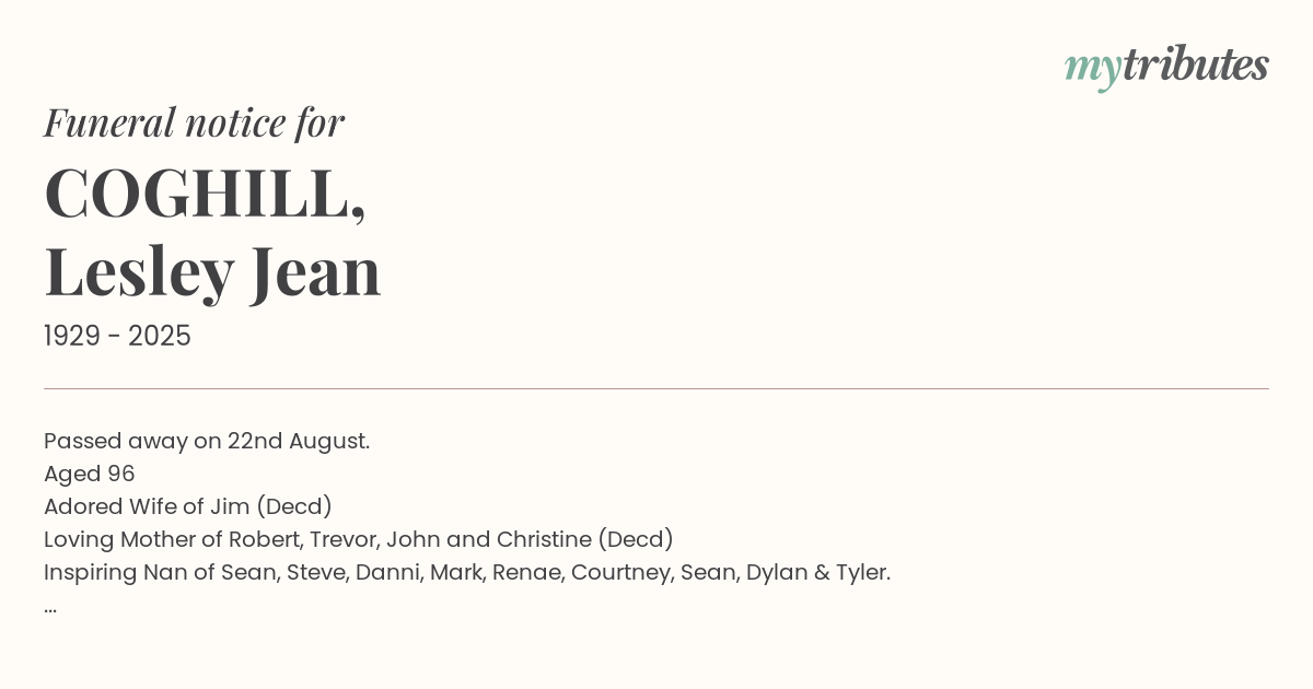 Family & friends are invited to attend a graveside service to celebrate Lesley's life, to be held at Allambe Memorial Park, Nerang, on Wednesday 3rd September at 10am.