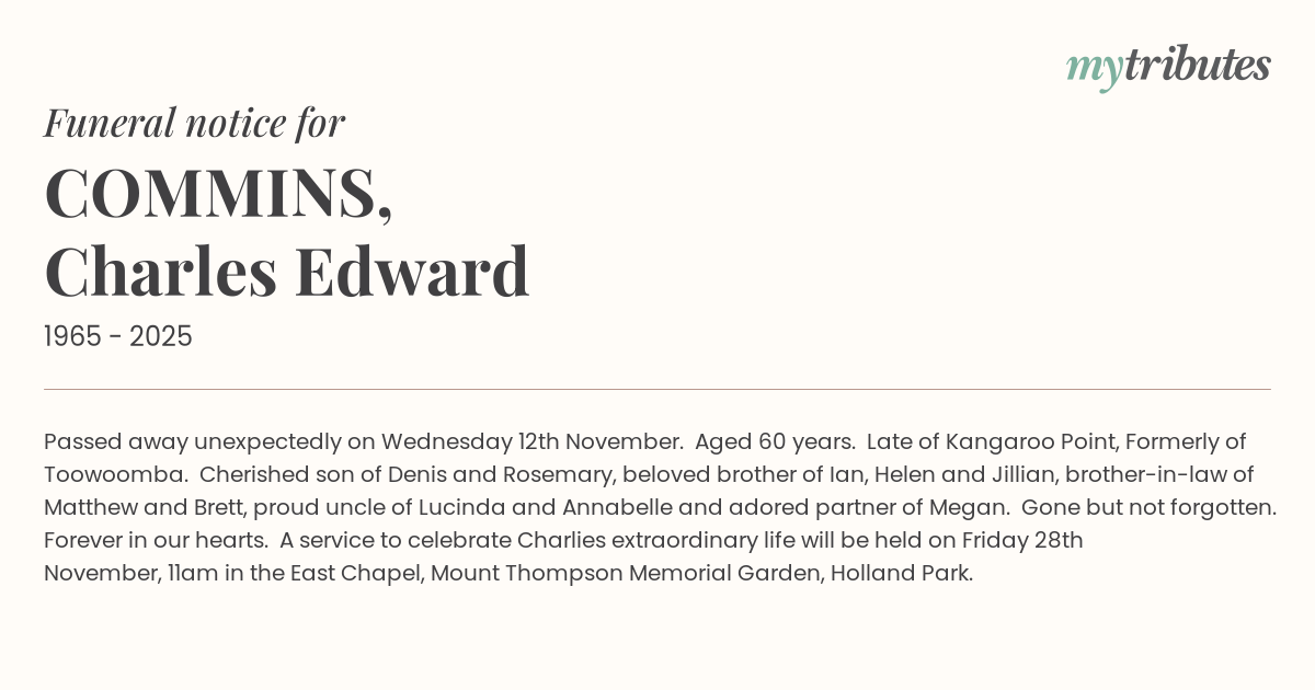 Passed away unexpectedly on Wednesday 12th November. Aged 60 years. Late of Kangaroo Point, Formerly of Toowoomba. Cherished son of Denis and Rosemary, beloved brother of Ian, Helen and Jillian, brother-in-law of Matthew and Brett, proud uncle of Lucinda and Annabelle and adored partner of Megan. Gone but not forgotten. Forever in our hearts. A service to celebrate Charlie’s extraordinary life will be held on Friday 28th November, 11am in the East Chapel, Mount Thompson Memorial Garden, Holland Park.