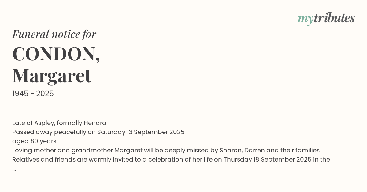 Relatives and friends are warmly invited to a celebration of her life on Thursday 18 September 2025 in the Garden Chapel, Albany Creek Memorial Park, 400 Albany Creek Road, Bridgeman Downs commencing at 1:30pm