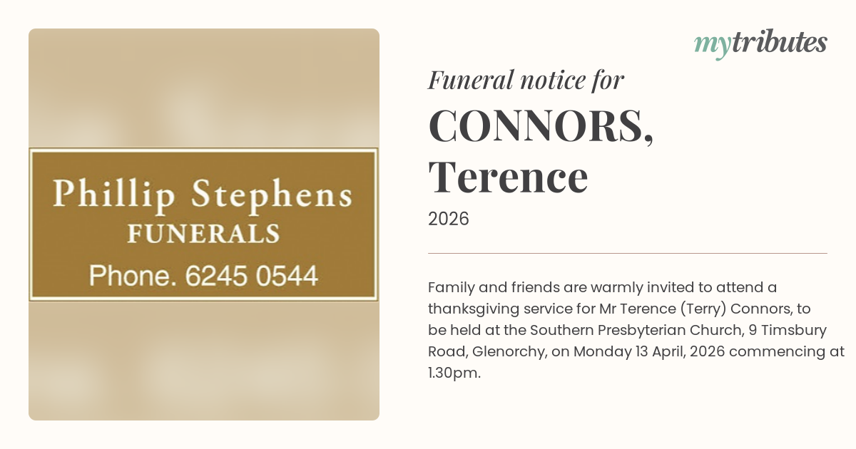 Family and friends are warmly invited to attend a thanksgiving service for Mr Terence (Terry) Connors, to be held at the Southern Presbyterian Church, 9 Timsbury Road, Glenorchy, on Monday 13 April, 2026 commencing at 1.30pm.