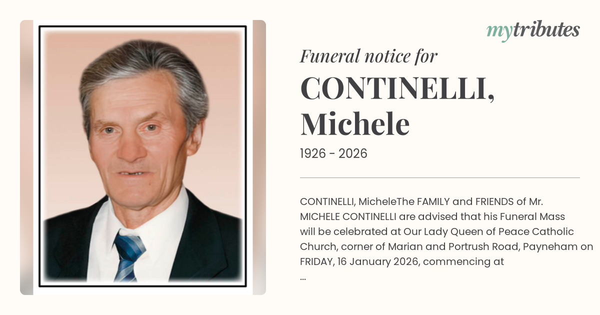 The FAMILY and FRIENDS of Mr. MICHELE CONTINELLI are advised that his Funeral Mass will be celebrated at Our Lady Queen of Peace Catholic Church, corner of Marian and Portrush Road, Payneham on FRIDAY, 16 January 2026, commencing at 11.00am.