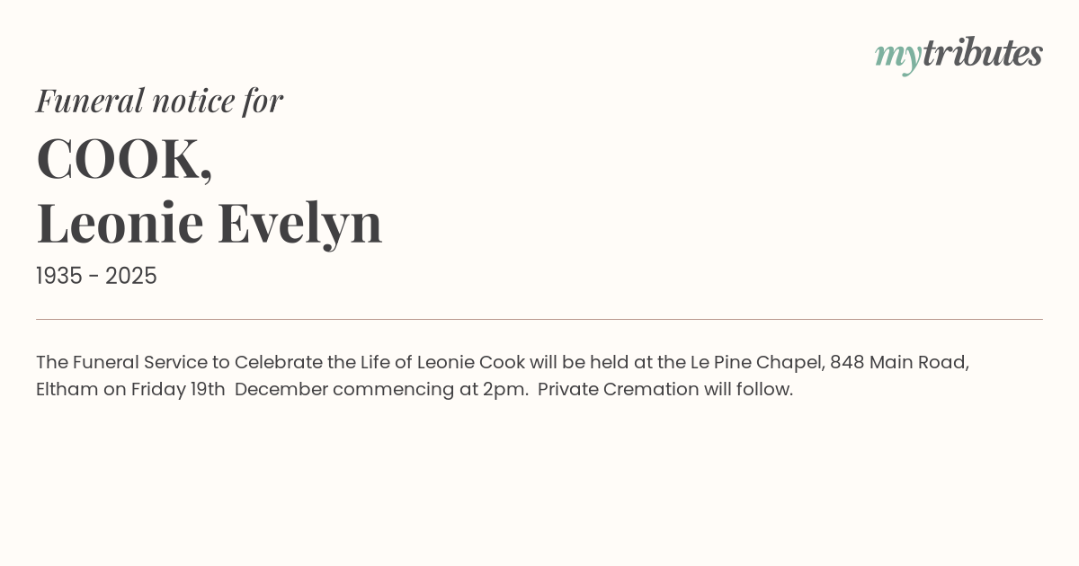 The Funeral Service to Celebrate the Life of Leonie Cook will be held at the Le Pine Chapel, 848 Main Road, Eltham on Friday 19th December commencing at 2pm. Private Cremation will follow.
