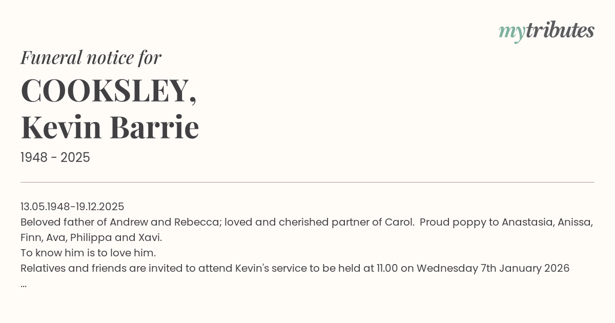 Relatives and friends are invited to attend Kevin's service to be held at 11.00 on Wednesday 7th January 2026 at Our Lady of the Rosary Parish, Kenmore Rd, Kenmore.