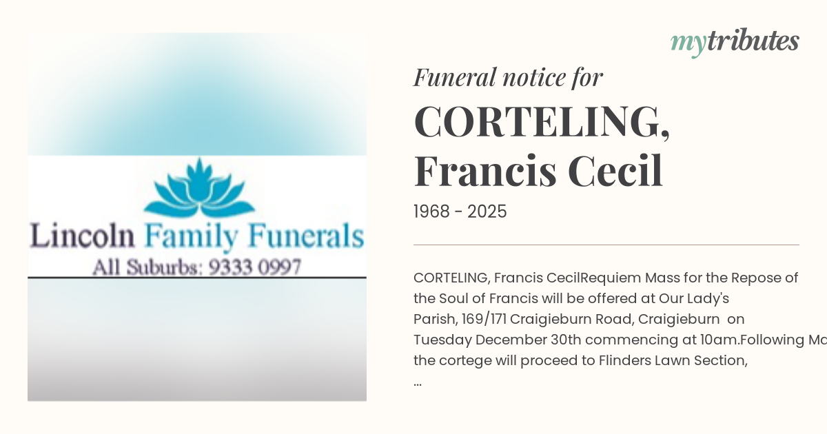 Requiem Mass for the Repose of the Soul of Francis will be offered at Our Lady's Parish, 169/171 Craigieburn Road, Craigieburn on Tuesday December 30th commencing at 10am.