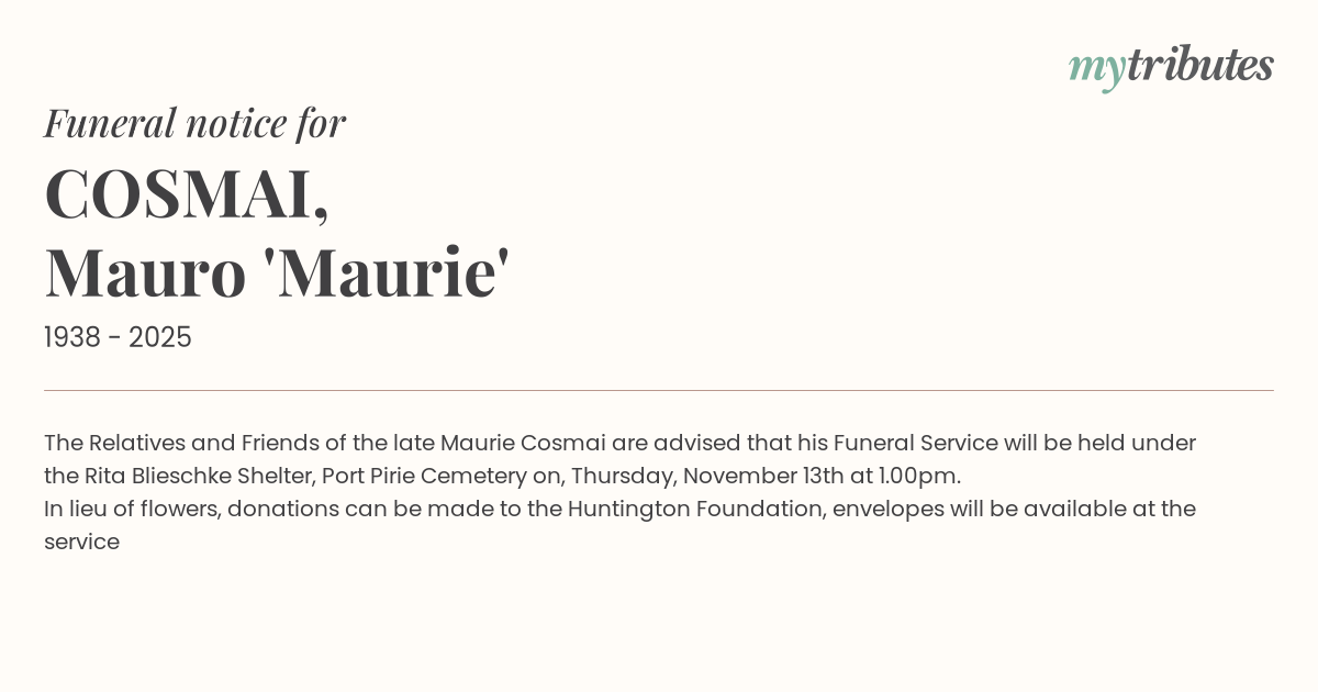 The Relatives and Friends of the late Maurie Cosmai are advised that his Funeral Service will be held under the Rita Blieschke Shelter, Port Pirie Cemetery on, Thursday, November 13th at 1.00pm.