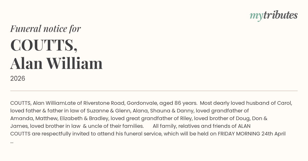 All family, relatives and friends of ALAN COUTTS are respectfully invited to attend his funeral service, which will be held on FRIDAY MORNING 24th April 2026, commencing at 10.00am in the Chapel of