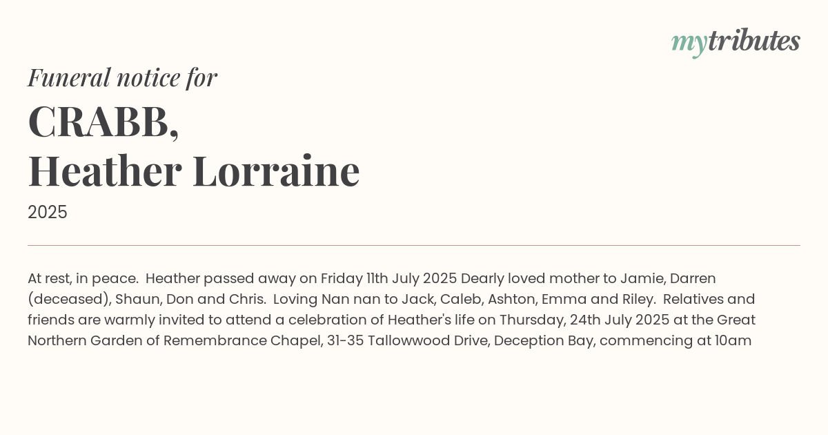 At rest, in peace. Heather passed away on Friday 11th July 2025 Dearly loved mother to Jamie, Darren (deceased), Shaun, Don and Chris. Loving Nan nan to Jack, Caleb, Ashton, Emma and Riley. Relatives and friends are warmly invited to attend a celebration of Heather's life on Thursday, 24th July 2025 at the Great Northern Garden of Remembrance Chapel, 31-35 Tallowwood Drive, Deception Bay, commencing at 10am