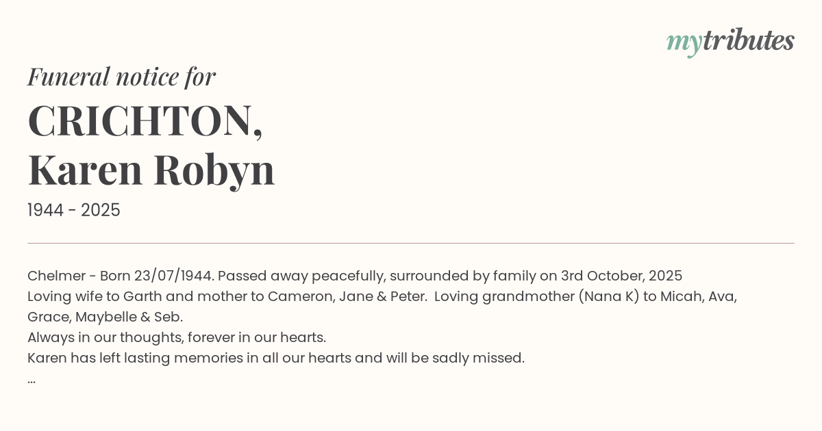 Chelmer - Born 23/07/1944. Passed away peacefully, surrounded by family on 3rd October, 2025 Loving wife to Garth and mother to Cameron, Jane & Peter. Loving grandmother (Nana K) to Micah, Ava, Grace, Maybelle & Seb. Always in our thoughts, forever in our hearts. Karen has left lasting memories in all our hearts and will be sadly missed. Relatives and Friends are invited to attend a Celebration of Karen's wonderful life at 2pm, Monday 13th October at the Brisbane Gold Club, 70 Tennyson Memorial Ave, Yeerongpilly.