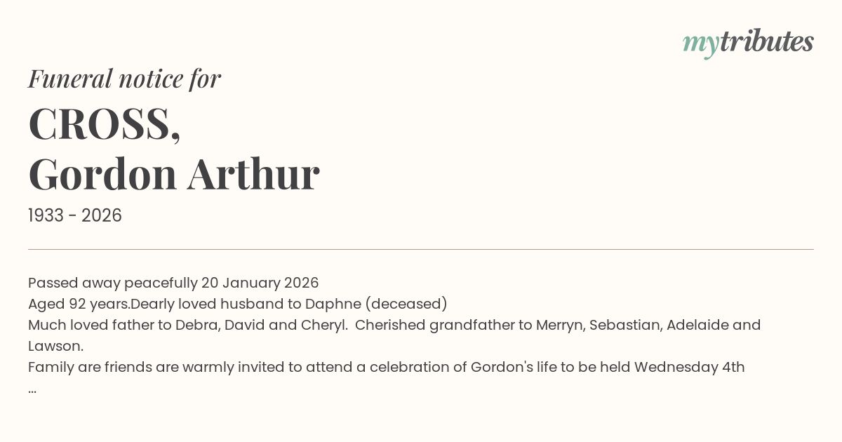 Family are friends are warmly invited to attend a celebration of Gordon's life to be held Wednesday 4th February 2026 in the Integrity Funeral Chapel, 18 Tonga Place, Parkwood, commencing at 12:30pm.