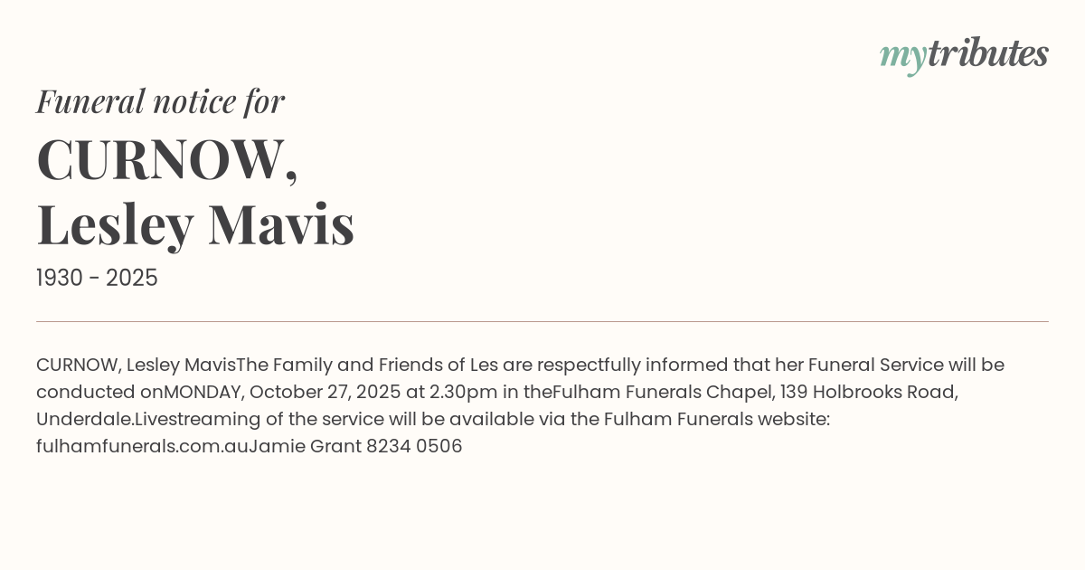 The Family and Friends of Les are respectfully informed that her Funeral Service will be conducted on
