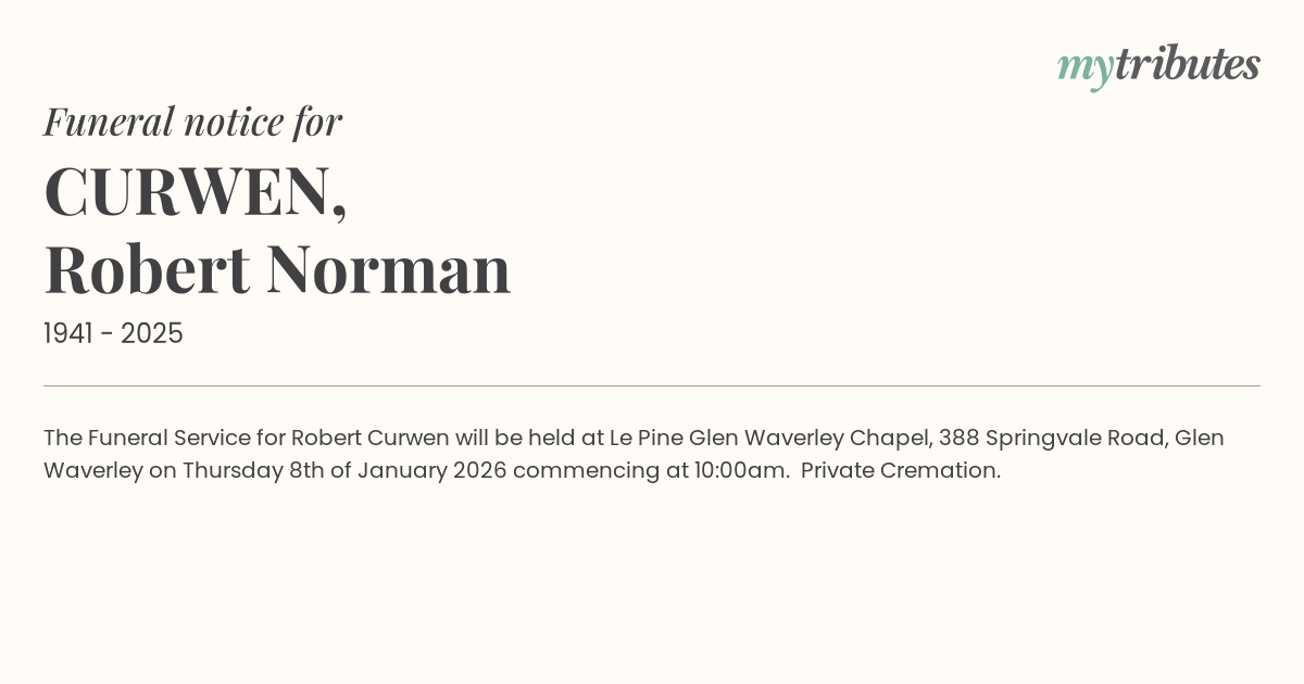 The Funeral Service for Robert Curwen will be held at Le Pine Glen Waverley Chapel, 388 Springvale Road, Glen Waverley on Thursday 8th of January 2026 commencing at 10:00am. Private Cremation.